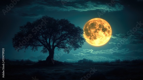 Fototapeta premium A large, bright full moon dominates the sky against a backdrop of dark,...