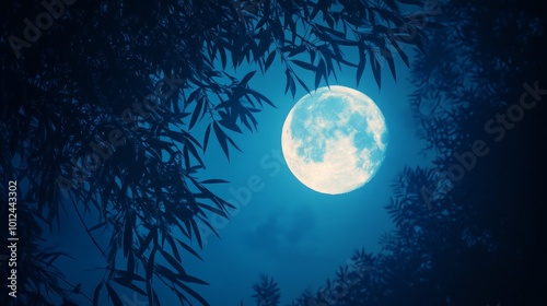 © Arifin Studio, Fototapeta premium A large, bright full moon shines in the night sky, partially obscured by silhouetted tree branches.