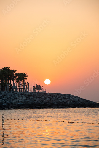 © Collab Media, Fototapeta premium A large, bright sun setting or rising over a dark, rocky breakwater, silhouetting palm trees and folded beach umbrellas against a vibrant orange and yellow sky