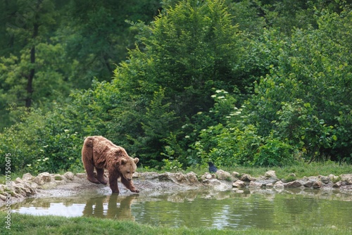 © Damian, Obraz premium A large, brown bear carefully steps toward the edge of a small pond, possibly to drink, on a sunny day near the green forest. A black bird is perched nearby