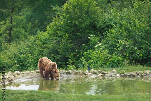 © Damian, Obraz premium A large brown bear quenches its thirst from a small watering hole. Lush green foliage surrounds the watering place, and a small bird perches nearby in Bavaria