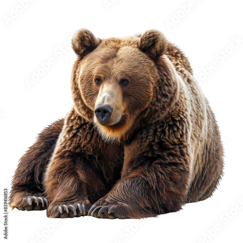 © Rona_65, Fototapeta premium A large brown bear sits with a calm expression, looking directly at the viewer. Its fur is thick and textured.