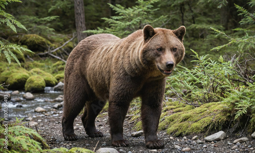 Fototapeta premium A large brown bear walks through a lush green forest near a stream