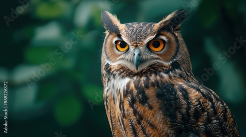 © Flowaiart, Obraz premium A large brown owl with yellow eyes is staring at the camera