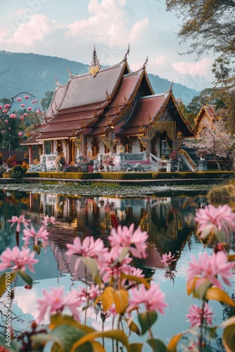 © Fotograf, Fototapeta premium A large building situated alongside a body of water