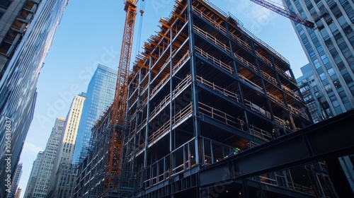 © fajar, Fototapeta premium A large building under construction with a crane in the background