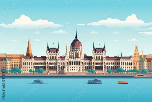 © Etverk Illustration, Fototapeta premium A large building with a body of water in front of it Generative AI