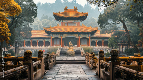 © jr-art, Naklejka premium A large building with a red roof and a statue of a lion in front of it