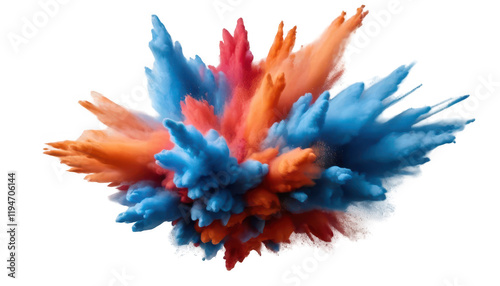Naklejka premium A large burst of blue, red, and orange powder creating a vivid explosion in the air, isolated on a white transparent background PNG