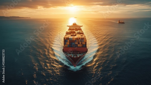 Fototapeta premium A large cargo ship is sailing through the ocean at sunset