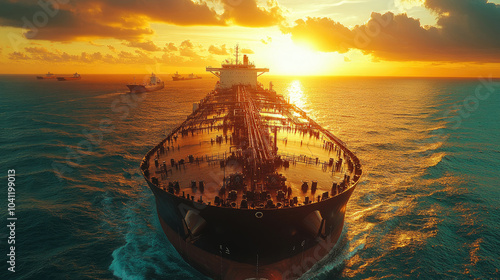 Fototapeta premium A large cargo ship navigates through the vibrant waters as the sun sets,...