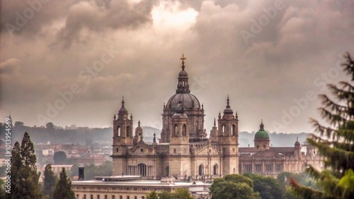© Wahyu_T, Naklejka premium A large cathedral with a dome and a cross on top, against a cloudy sky, surrounded by trees and buildings.