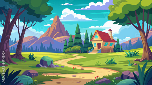 © Vector illustration, Fototapeta premium a large clearing and a house on the horizon vector illustration