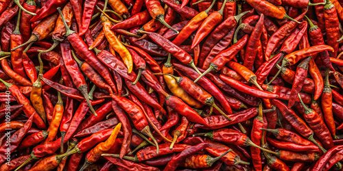 © Roman, Fototapeta premium A large collection of bright red chili peppers lies on a wooden surface, highlighting their vibrant hues and varying shapes. This arrangement emphasizes the freshness and abundance of the harvest