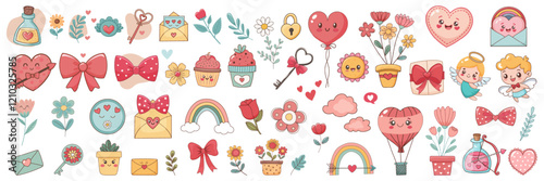 Fototapeta premium A large collection of 54 love-themed stickers featuring cute and happy Valentine's Day elements such as hearts, flowers, Cupid, rainbows, love letters, love potions, and more. Vector graphics