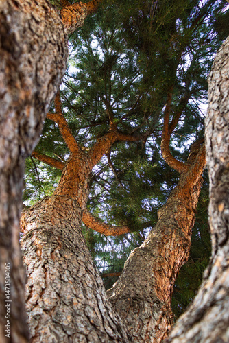 Obraz premium A large coniferous tree with large branches against a blue sky, viewed from...