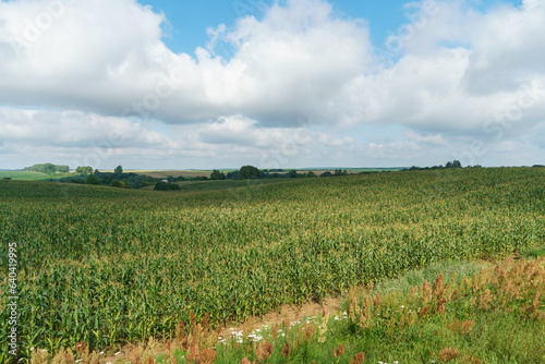 © Pokoman, Fototapeta premium A large cornfield and white fluffy clouds. A farm for growing corn for cattle feed.