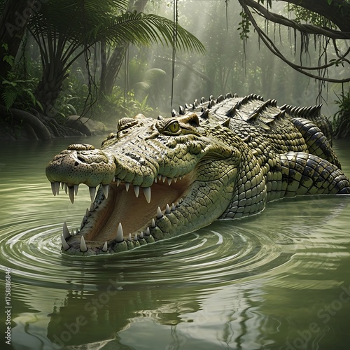 © Teguh, Obraz premium A large crocodile rests in a tranquil jungle setting, its jaws agape, showcasing impressive teeth and scales.