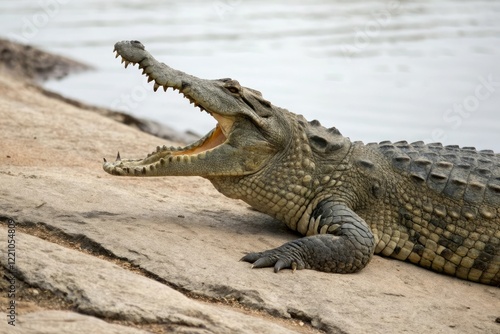 Obraz premium A large crocodile's jaws are stretched wide apart revealing a glimpse of the...