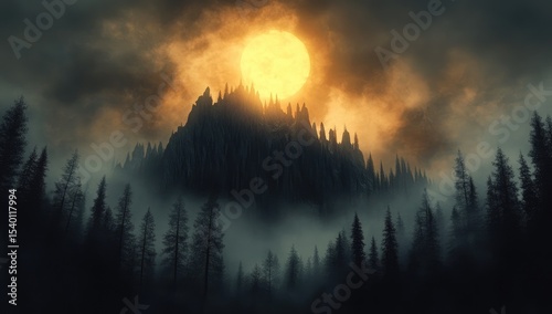 © Abdul, Fototapeta premium A large, dark mountain range rises into a stormy, orange-lit sky, looming over a misty forest