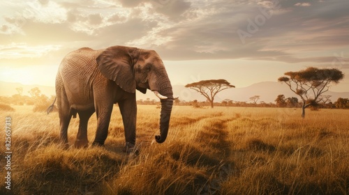 © Space Priest, Obraz premium A large elephant is walking through a grassy plain