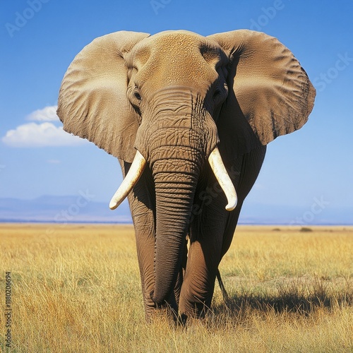 Naklejka premium A large elephant walks across a dry grass field, capturing the simplicity and...