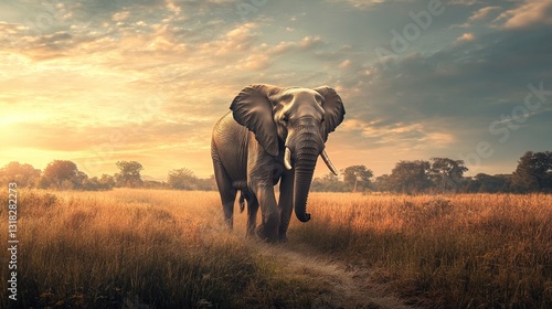© Herlita, Naklejka premium A large elephant walks gracefully across a grassy landscape at dusk