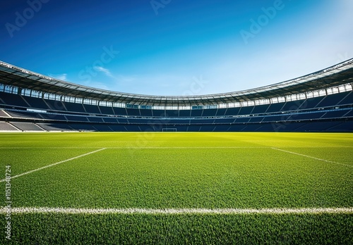 © yong, Fototapeta premium A large, empty football stadium with green grass and blue sky in the background.