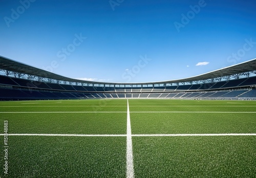 © yong, Fototapeta premium A large, empty football stadium with green grass and blue sky in the background.