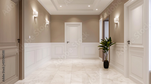 © Valeria Venezia, Obraz premium A large, empty hallway with white walls and white doors. The hallway is lit by overhead lights