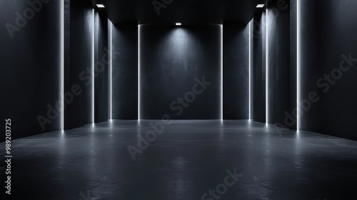 © Dumrongkait, Fototapeta premium A large, empty room with a black floor and white walls. The room is lit by a series of lights, creating a stark and minimalist atmosphere