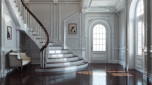 © Ghiska, Obraz premium A large, empty room with a white staircase leading up to a door. Generate AI image