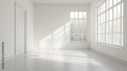 © Interiors and Design, Obraz premium A large, empty room with white walls and wooden floors