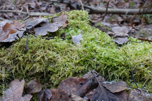 © Aleksandr, Obraz premium A large fallen tree in the forest is covered with green moss.