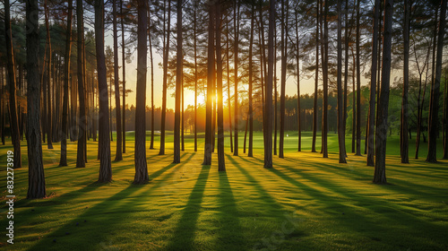 © wanchai, Naklejka premium A large field of grass with trees in the background. The sun is setting, casting long shadows on the grass