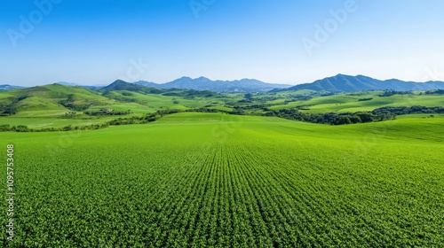 © AH TAR STOCK, Naklejka premium A large field of green grass with mountains in the background