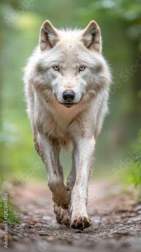 Fototapeta premium A large, fierce white wolf dashes through the lush green forest.