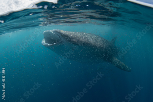 Naklejka premium A large, filter-feeding whale shark, Rhincodon typus, slowly swims in shallow...