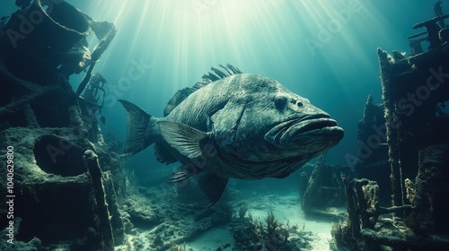 © AGUNG, Fototapeta premium A large fish swimming among underwater ruins and sunlight.