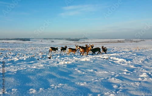 © avs_lt, Naklejka premium A large flock of roe deer on the snowy field at sunny winter day. Flock of European roe deer (Capreolus capreolus).