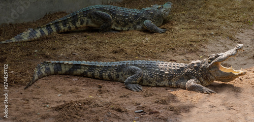 © KE.Take a photo, Fototapeta premium A large freshwater crocodile is sunbathing on the ground.