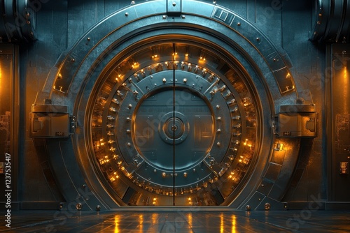 Fototapeta premium A large, futuristic vault door illuminated by warm lights, set in a metallic environment, suggesting security and secrecy.