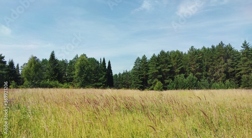 © Sergey Egovkin, Fototapeta premium a large glade with tall grass near the forest on a sunny day against a blue sky
