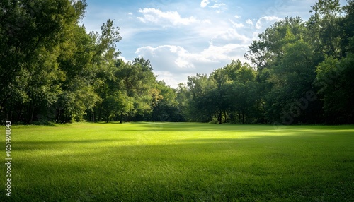 © Studicon, Naklejka premium A large, grassy field with trees in the background. The sky is blue with some clouds