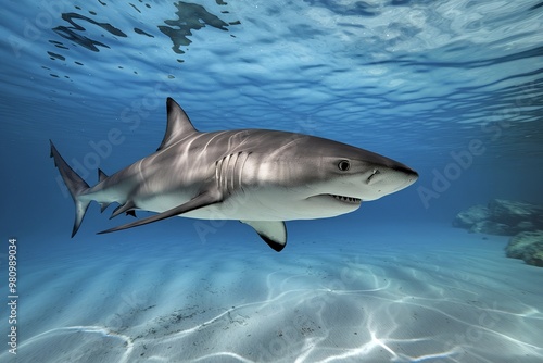 © Sergiu, Fototapeta premium A large gray shark swimming in clear blue water