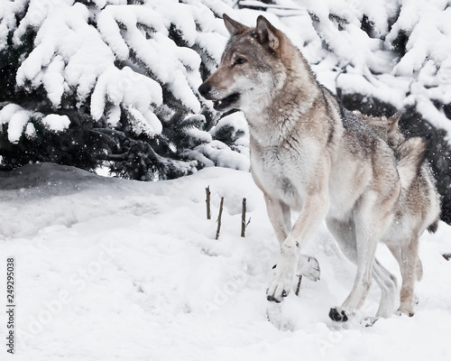 © Mikhail Semenov, Obraz premium A large gray wolf with a vigorous face quickly rushes through the forest with snow-covered trees, he quickly runs out.