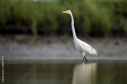 © rayhennessy, Fototapeta premium A large Great Egret wades in shallow water searching for food with its reflection.