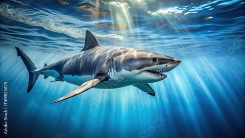 Fototapeta premium A large great white shark gliding effortlessly through the crystal-clear waters of the ocean