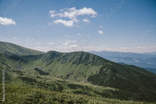 © Дмитро Григорчак, Naklejka premium A large green field with a mountain in the background