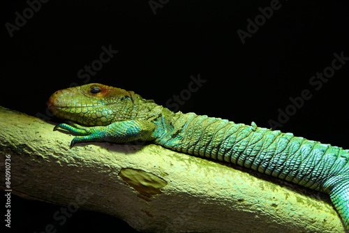 Naklejka premium A large green lizard with a colorful head basking on a branch against a black...